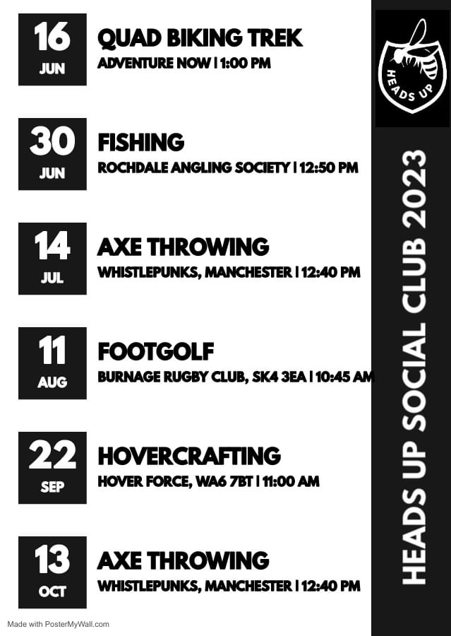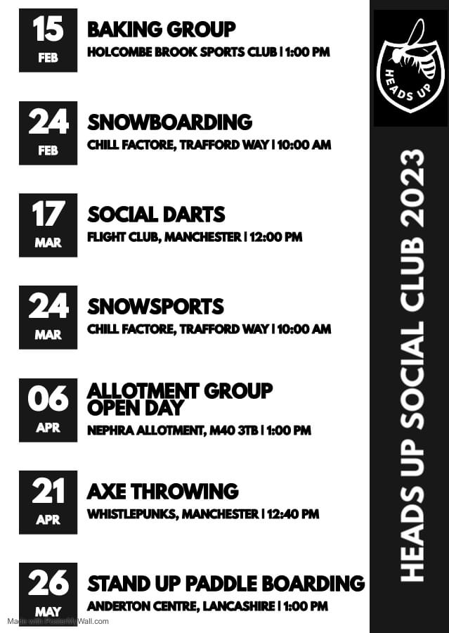 We are adding new events to our Heads Up Social club all the time. To keep up to date with our events, follow Heads Up Therapies on the link below and sign up to receive our newsletter.